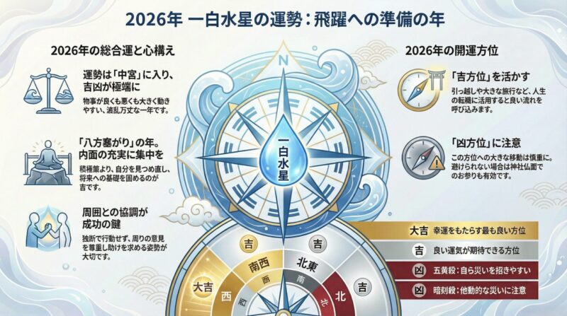 「2026年、一白水星は八方塞がり」と耳にして不安を抱いていませんか?しかし九星気学で深く紐解くと、今年は“うまく動けない年”ではなく、あなたの人生を整え直すための特別な一年です。年盤の中宮に入ることでプレッシャーを感じやすくなる一方、内側を磨くほど強く輝く運気でもあります。本記事では、2026年の仕事・恋愛・金運・健康・開運行動まで、初心者にも分かりやすく徹底解説します。来年を不安ではなく「人生の転換点」に変えていきましょう✨